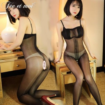 女式透明油亮連褲黑絲襪開抹胸式高腰薄款誘惑連體襪衣
