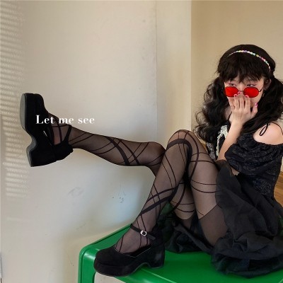 小眾甜酷辣妹白色絲襪紫色交叉綁帶連褲襪日系Lolita印花打底襪女